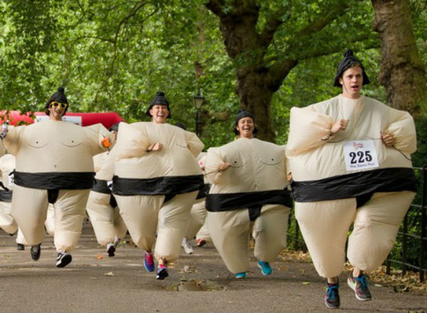 En Londres un grupo de corredores británicos se disfrazaron con trajes de sumo inflable, estableciendo el récord del mayor maratón en traje de sumo.