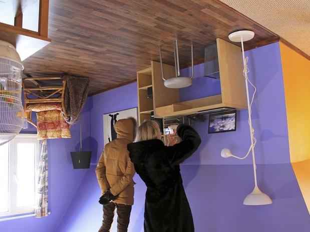 Sólo con entrar por la puerta se experimenta sensación de vértigo, no tanto porque los muebles estén pegados al techo, sino por una ligera inclinación del suelo. Una casa »al revés», con el techo clavado en la nieve que cubre el principal centro de exposiciones de Moscú, tiene dos pisos que cuentan con una habitación para niños, un salón, un comedor, un dormitorio y un baño, se ha convertido de la noche a la mañana en una atracción turística.