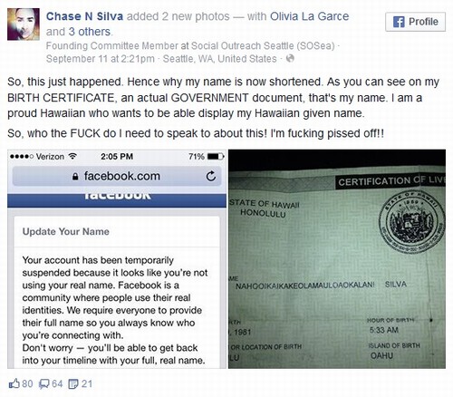 Chase Nahooikaikakeolamauloaokalani Silva no fue reconocido por Facebook como real, aún cuando es el verdadero nombre de pila del usuario… Así que ya saben, nada de ponerse creativos con los nombres de sus hijos!!!