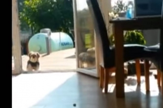 Sus dueños se dieron cuenta que no cachaba nada y uno de ellos simuló que le abrió la puerta, y así entró corriendo, como un perrito muy obediente.