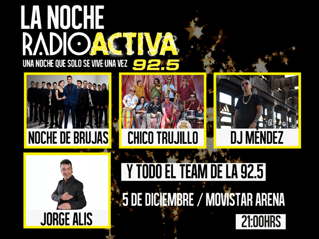 Exclusivo para los que saben que Sólo se Vive una Vez!!! Noche de Brujas, Jorge Alís, Chico Trujillo y ahora DJ Méndez!! Junto a todo el equipo de la 92.5, harán que la fiesta no pare este 5 diciembre en el Movistar Arena.