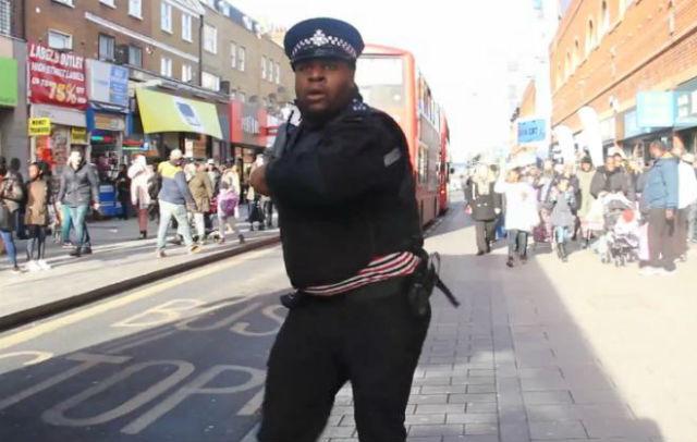Hay dos alternativas: El poli’ se equivocó de profesión o ama mucho su pega. Lo cierto es que este hombre de la ley llamó la atención de muchos transeúntes en las calles con excéntricos pasos mientras escuchaba música.