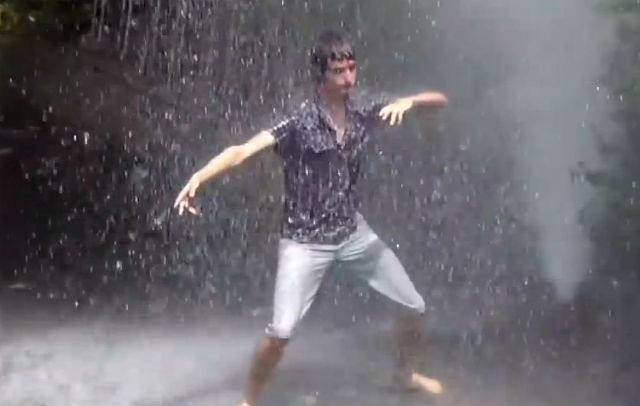 Las imágenes muestran como el cabro goza de lo lindo con el agua y se va en la media volá con los pasos de baile. Tanta emoción le puso el bailarín que al final de la coreografía se desplomó del cansancio.