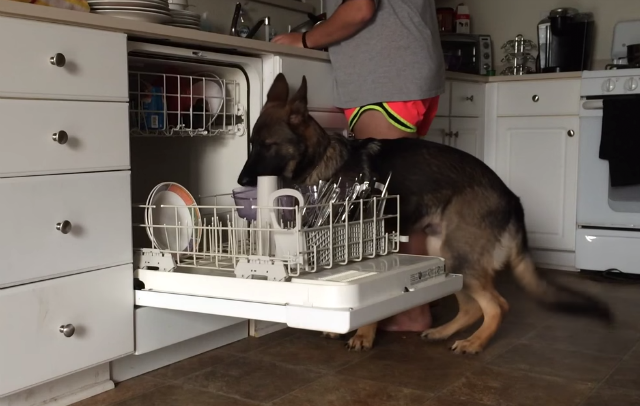 El animal, que altiro inspira buena onda, además de hacerle compañía a su querido amo, también lo ayuda a lavar la loza. ¿Buena cierto? Si pues, el dueño deja unos plásticos sobre la mesa y Baron, bien motivado, los coloca en el lava vajillas, se pasó para buena tela.