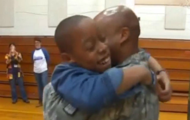 Un soldado norteamericano estuvo un año de servicio en Kuwait. Durante ese tiempo no pudo ver a su familia ni a su querido hijo. Por eso cuando el recluta cumplió su tarea y regresó a casa no aguantó más y fue al colegio de su hijo para verlo.