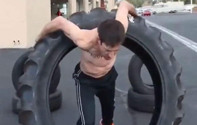Este compadre agarra una rueda de tractor y con la fuerza se la pone en la cintura. Ya, hasta ahí pasa piola si uno quiere hacer ejercicios de fuerza. Pero lo que hace después es para ponerse de pie: el loco se pone a bailar el ula ula como si fuera un aro de gimnasia cualquiera. Un movimiento que igual hay que practicarlo, pero sirve para ejercitar el meneo.