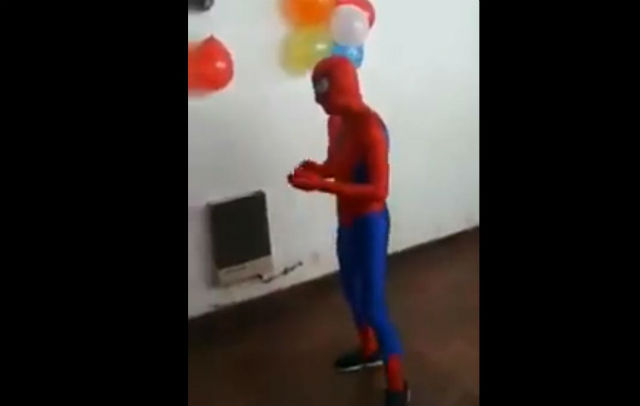 Todo iba de lo lindo, el hombre disfrazado comenzó a hacer su show: que consistió en intrépidas vueltas de carnero contra la pared, una tras otra hasta que finalmente llegó el turno de que un pequeño participara. El Hombre Araña mostró su habitual técnica, pero la hazaña no terminó bien. Al momento de caer el lolo se dio de lleno en el piso. Las risas poco a poco comenzaron a ceder contrastado por un silencio que evidenció el dolor del accidentado.