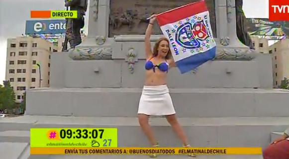 La animadora llegó tempranito a Plaza Italia y, con un bikini y una mini blanca, se paseó con una bandera de la U. La gracia prendió como pasto seco en Twitter y fue Trendic Topic con el hasthtag #ElBikiniDeKaren . Aquí te dejamos una galería para que disfrutes con el divertido momento.