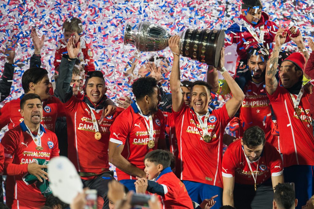 Photo during the celebration after the match Chile vs Argentina, corresponding to the Great Final to the XLIV Copa America Chile 2015 at Nacional Julio Martinez Pradanos stadium, Santiago, Chile, in the photo: Alexis Sanchez and Players of Chile champion of the America Cup 2015