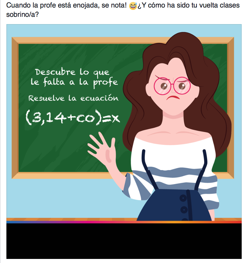 La foto muestra a una profe con cara de enojada, junto a una ecuación. «Descubre lo que le falta a la profe», escribió la marca en la publicación.
