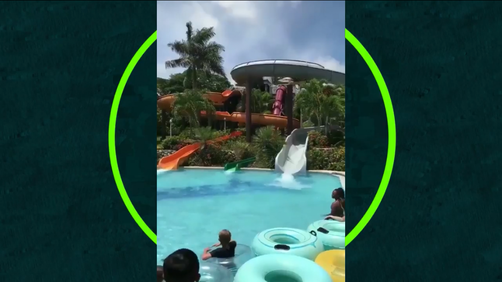 En el registro se ve cómo el chiquillo se lanza por el tobogán y al llegar a la piscina, en vez se zambullirse en el agua, como todos lo hacen, él logra deslizarse sentado y rozando la superficie del agua, hasta que logra alcanzar la orilla y se pone de pie.