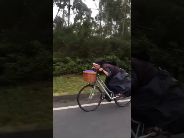 En las imágenes se puede ver a una religiosa en una bici en posición aerodinámica, sin casco y con sandalias,completamente concentrada.