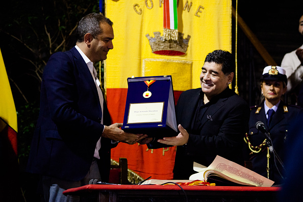 El «10» brilló en el Napoli en la década de los 80, donde marcó 115 goles y fue homenajeado en Italia. Tras la ceremonia el argentino fue invitado a una cena, donde tuvo dificultades para hablar tras mostrarse en un evidente estado de ebriedad. De hecho Diego no pudo cortar la torta y tuvo que ser retirado por sus guardias de seguridad.