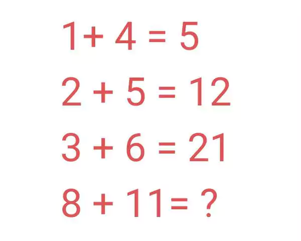 Pero la segunda respuesta, y la que más cuesta encontrar, consiste en lo siguiente. Tomar el signo + como multiplicación y sumar al resultado la primera cifra de la cuenta. ¿Cómo? En la primera cuenta hay que sumar 1 a 1 x 4 , en la segunda línea hay que sumar 2 a 2 x 5, en la tercera hay que sumar 3 a 3 x 6 y en la última hay que sumar 8 a 8 x 11, lo que daría un resultado de 96.