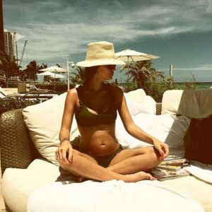 La joven publicó una fotografía donde luce un bikini y se puede ver su ya abultado vientre, junto al mensaje «Summer vibes«.