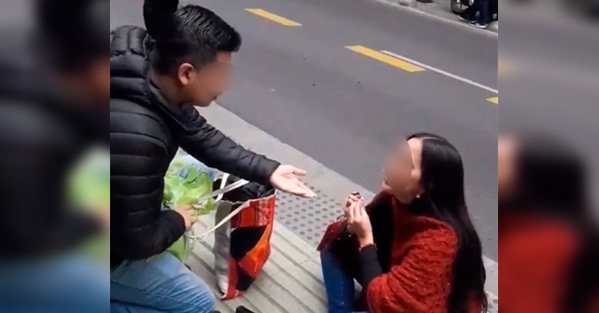 El video se viralizó en cosa de minutos. En el se ve cómo una mujer le pide matrimonio a un hombre, sentada en el piso, en plena calle San Antonio en el centro de Santiago.