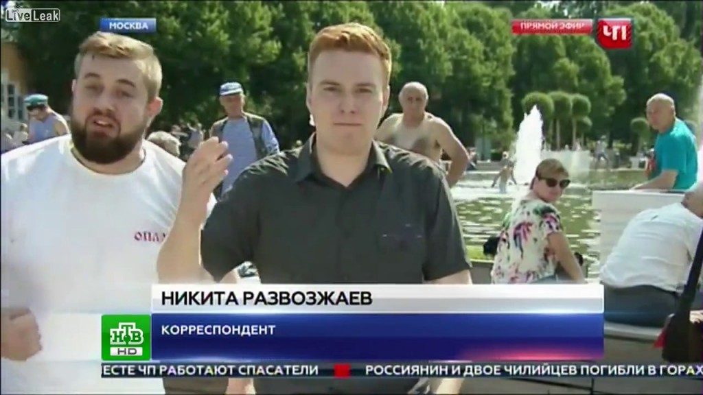 Pero algo muy distinto le ocurrió a un periodista ruso. El profesional de la cadena HTB, realizaba un enlace pero de forma repentina apareció un sujeto que comenzó a realizar gestos a la cámara, provocando la incomodidad del reportero. Tras esto el desconocido golpeó duramente en el rostro al trabajador.