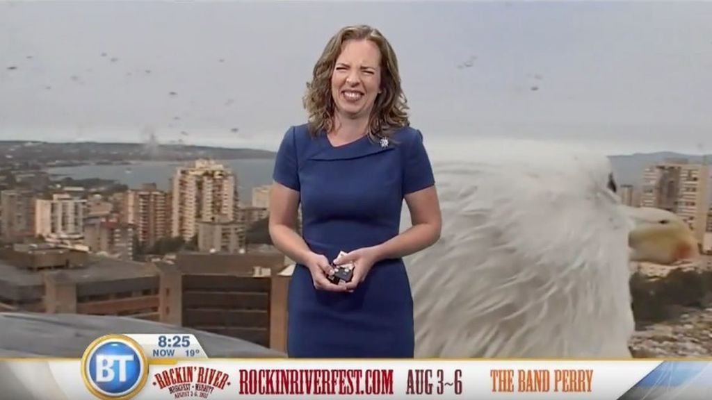 Esto ocurrió en el espacio «“Desayuno en Vancouver” de Canadá, ya que cuando la presentadora Tara Jean Stevens entregaba el informe meteorológico, detrás de ella se vio una gigantesca ave que justo se había parado donde estaba la cámara que graba la ciudad.