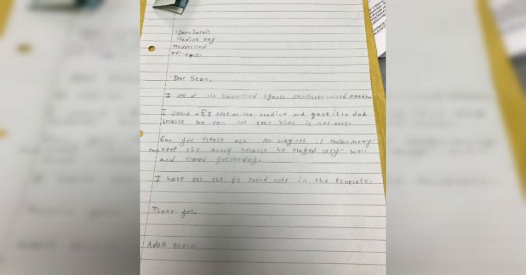 «Estuve en el estadio del Huddersfield en el partido contra el United. Me encontré un billete de cinco libras en el estadio y se lo di a mi padre porque no podemos quedarnos cosas que no son nuestras. ¿Podrías, por favor, preguntarle al entrenador Wagner si Aaron Mooy puede guardar el dinero? Jugó muy bien y marcó un gol ayer. He puesto el billete de cinco libras en el sobre. Gracias. Adam Bhana», escribe la carta que envió el pequeño a Sean Jarvis.