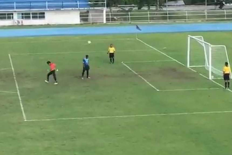 Durante un partido de fútbol de Tailandia se registró sin duda uno de los tiros más locos de la historia. Resulta que un futbolista pateó pero la pelota dio en el palo, lo que produjo que el arquero saliera corriendo a celebrar el triunfo.