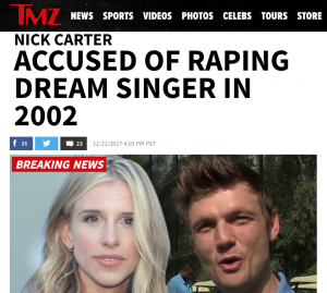 Las denuncias por abuso sexual y escándalos que sacuden al mundo del espectáculo parecen no acabar ya que recientemente la cantante norteamericana Melissa Schuman (ex Dream) acusó a Nick Carter de los Backstreet Boys de haberla violado en 2002, cuando ella tenía 18 y él 22.