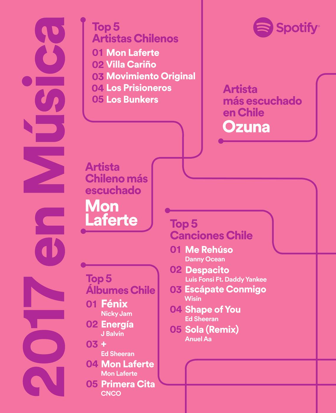Sobre muisca general los chilenos dejaron en primer lugar al venezolano Danny Ocean, que con «Me Rehúso», se convirtió en la canción más escuchada en Chile, mientras que «Despacito» que quedó en segundo lugar.