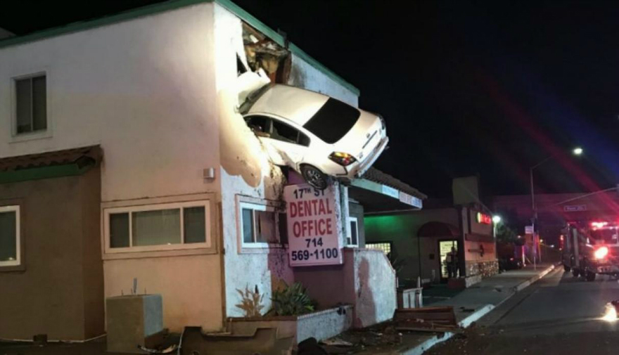 El hecho ocurrió el domingo en el sur de California, Estados Unidos, luego que el conductor de un auto marca Nissan Altima perdiera el control al pisar un divisor central y se elevara por los aires. El vehículo terminó incrustándose en el segundo piso de un consultorio de un dentista.
