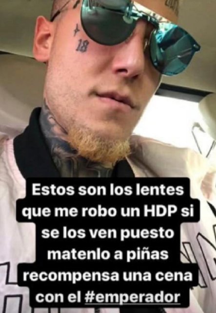 «Estos son los lentes que me robó un HDP. Si se los ven puestos mátenlo a piñas. Recompensa: una cena con #ElEmperador (tal como él mismo se hace llamar)», agregó.