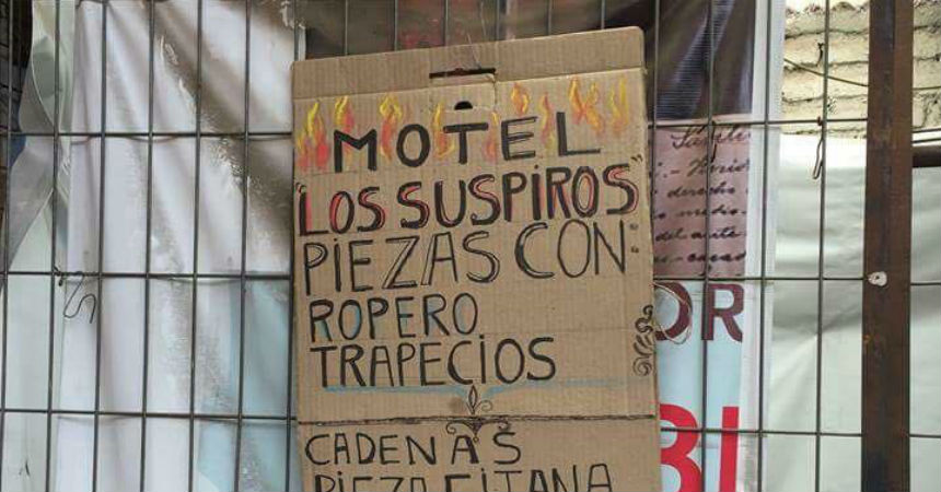 Se trata del motel “Los Suspiros”, que en un precario cartón publicita sus servicios y opciones de habitaciones, como por ejemplo, pieza con ropero, estilo “gitana” o japonesa.