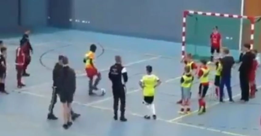En medio de un partido de fútbol reducido, que se estaba jugando dentro de un gimnasio, uno de los pequeños debía patear un penal. Ante la atenta mirada de los otros jugadores y de los profesores que estaban en el lugar, el joven tenía una gran responsabilidad con su equipo.