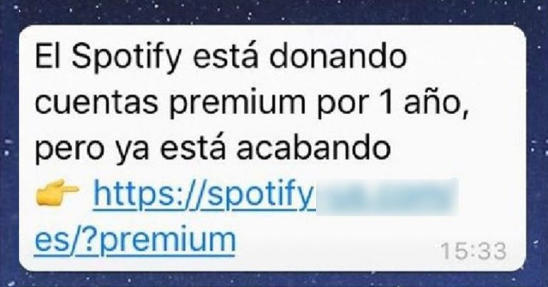 «Spotify está donando cuenta premium por 1 año, pero ya está acabando», asegura el mensaje que se ha viralizado a través de la aplicación de mensajería, cuenta ADN Sur.
