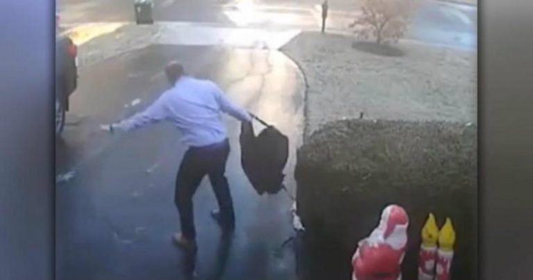 En el registro se ve a su esposo salir de la casa intentado cruzar un resbaladizo pavimento dejado por las nevadas pero por lo visto Tim Besecker falló en el intento ya que por más que trató de mantener el equilibrio terminó en el suelo
