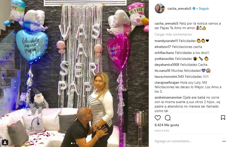 Por esto publicó imágenes del feliz momento en redes sociales: “Feliz por la noticia vamos a ser papás. Te amo mi amor”, escribió el ‘Cacha’ Ríos junto a una fotografía besando el vientre de Karla Gutiérrez.