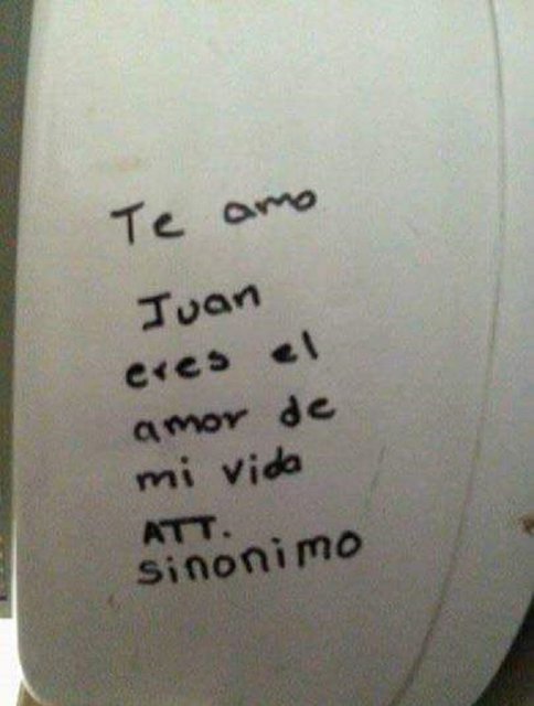 «Te amo Juan, eres el amor de vida. Atte: Sinónimo», dice el mensaje, desatando cientos de burlas, pues el autor se confundió y en realidad quiso escribir «anónimo», según indica La República.