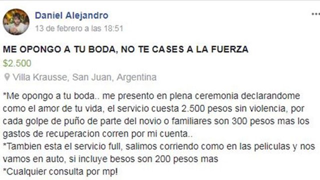 «Me opongo a tu boda.. me presento en plena ceremonia declarándome como el amor de tu vida, el servicio cuesta 2.500 pesos (125 dólares) sin violencia, por cada golpe de puño de parte del novio o familiares son 300 pesos (15 dólares) más. Los gastos de recuperación corren por mi cuenta», publicó el joven identificado como Daniel Alejandro.
