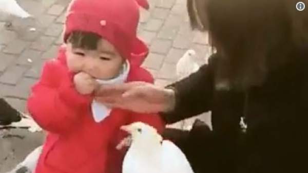 En el breve registro se puede ver a la pequeña junto a su madre alimentar a las palomas, pero una de ellas se posó en el brazo de la mujer para comer migas de pan y ahí fue cuando la peque la agarró del cuello y le quitó la comida para comérsela ella.