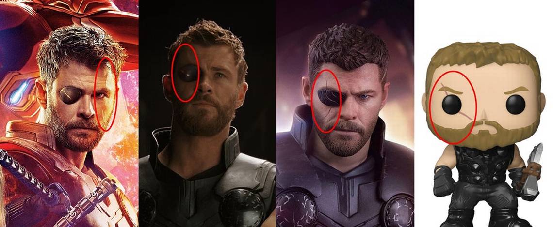 En la última película de Thor (Chris Hemsworth) pierde un ojo durante la lucha con su hermana Hela, por lo que queda con un parche y una cicatriz, pero en la imagen se ve que en un lado tiene el parche y en el otro ojo la cicatriz.