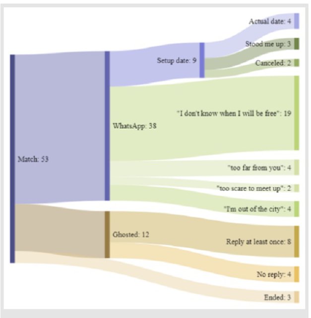De ese total de Match, conversó con 50 chicas y con otras 3 no intentó ninguna interacción, por lo que esas conexiones fueron canceladas. Otras 4 no respondieron a su saludo en la aplicación y 8 respondieron sólo una vez para luego perder el contacto.