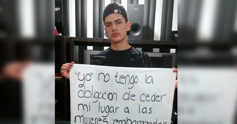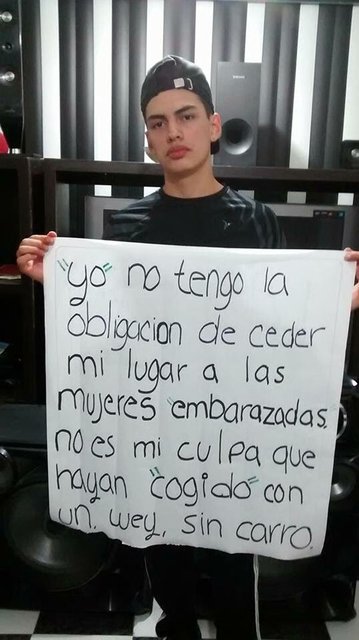 La imagen de un muchacho, aparentemente mexicano, se ha viralizado por las redes sociales por el mensaje que tiene escrito en un cartel. El muchacho afirma que no está obligado a ceder el asiento a las embarazadas, pero de una horrible manera.