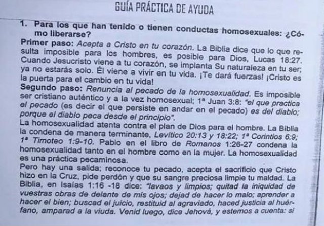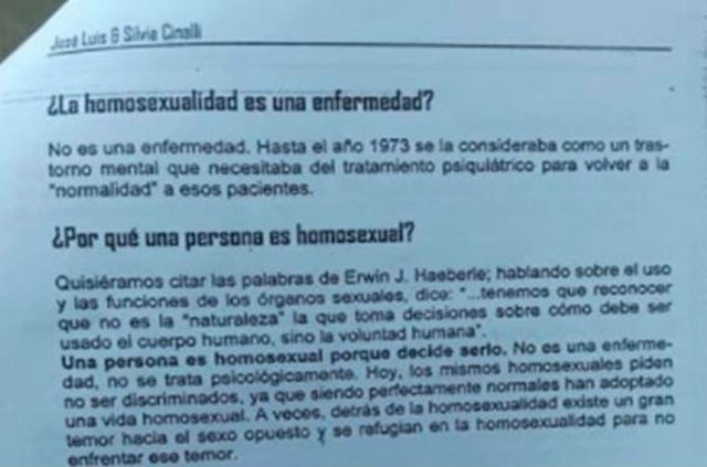 Los alumnos publicaron imágenes de las fotocopias del material, que incluye frases como «la homosexualidad es una práctica pecaminosa» que «atenta contra el plan de Dios» y «una abominación religiosa». Pero lo más increíble es que luego de la denuncia, desde el colegio reconocieron ese material como parte de su contenido educativo.