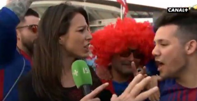 La reportera Marina Lorenzo del Canal +, estaba despachando en la previa de la final de la Copa del Rey entre el Barcelona y el Sevilla, en medio de un incontrolable grupo de fanáticos catalanes que no la dejaban hacer su trabajo en paz.