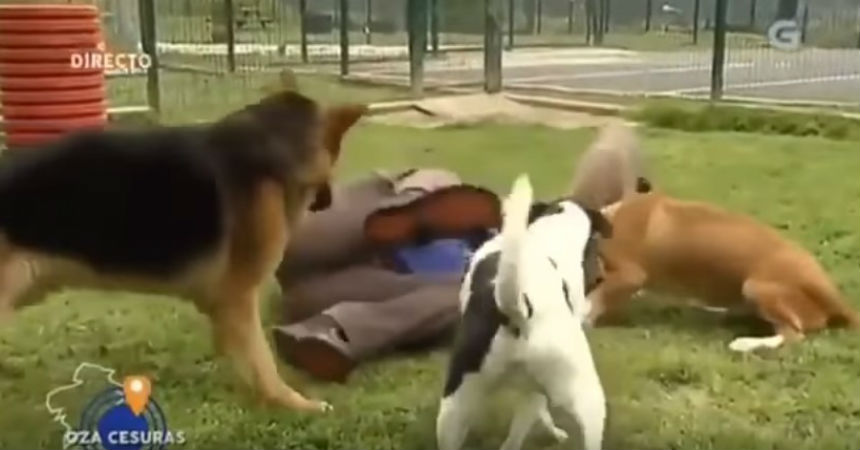 La nota no se hizo popular por su contenido, la periodista ni por el entrevistado, sino por lo que ocurre detrás. Y es que mientras el director de un centro canino en Galicia, España, conversa normalmente, uno de los adiestradores es arrastrado por los perros pero nadie se percata.