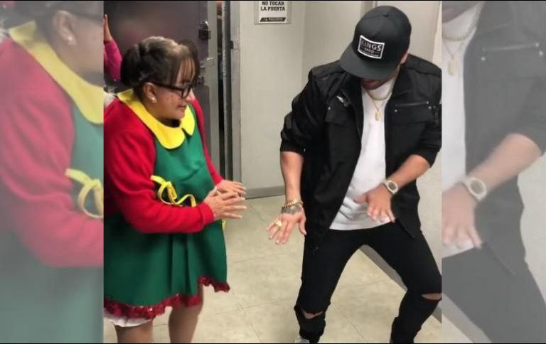 «La Chilindrina» se encontró con el cantante de música urbana Valentino en los pasillos de un estudio de televisión así que no perdió la oportunidad para aprender el ritmo de moda.