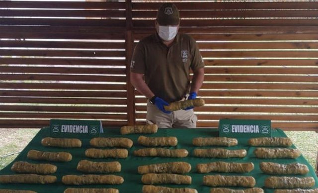 «A raíz de lo anterior, se instaló un servicio de control, el que aproximadamente a las 02:00 horas se procedió a la fiscalización de dos vehículos. El que trasladaba al investigado y un segundo vehículo que lo acompañaba, y mediante el apoyo de un can detector de drogas se logró establecer que ocultó en el tablero y en los costados del segundo móvil se mantenía la droga, extrayendo desde el interior la cantidad de 32 paquetes de forma cilíndrica contenedores de marihuana prensada con un peso bruto de 12 kilos 695 gramos», informó Carabineros en un comunicado.