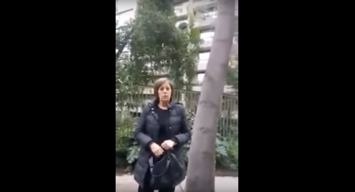 En las imágenes se puede ver como al principio la mujer sostiene un martillo en la mano izquierda, mientras increpa a los trabajadores, por dejar restos de basura mientras limpian la calle. Después termina guardando la herramienta en su cartera.