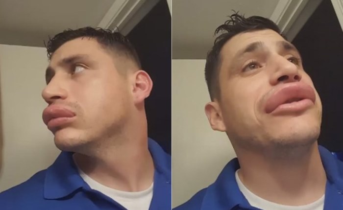 Aunque suene raro el hombre protagonista de este video fue mordido por dos avispas. Tan fuerte fue la reacción que sus labios, sobre todo el superior, quedaron hinchados de tal forma que parece que se hubiera inyectado botox o algún tipo de producto cosmético.