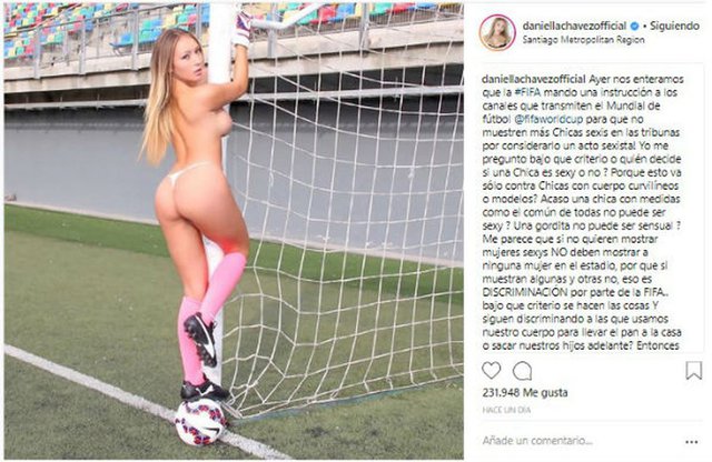 Daniella Chávez se enojó con la FIFA y desató su furia a través de Instagram. La conejita Playboy se molestó por el supuesto instructivo a los canales que transmitían el Mundial de no enfocar a mujeres atractivas durante la final de la Copa del Mundo.