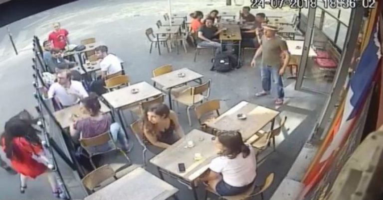 En las imágenes se ve la agresión, seguida de la intervención de varios testigos que estaban en la terraza del café, que intentaron hablar con el hombre después del incidente, y que le impidieron volver a acercarse a la víctima. Finalmente el agresor se fue del lugar, impune.