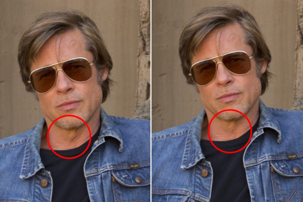 Al protagonista de «Titanic» claramente le retocaron la zona de su barbilla, con el cual se ocultaba parte de su papada. Al mismo tiempo, a Brad le editaron parte de su cuello, quitando algunas arrugas en el lugar.