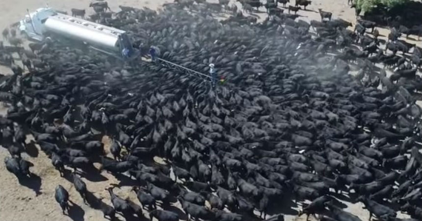 Las imágenes reveladas por Fox News muestran a una manada de 1.300 vacas que rodean un camión cisterna cargado con agua destinada a su hidratación.